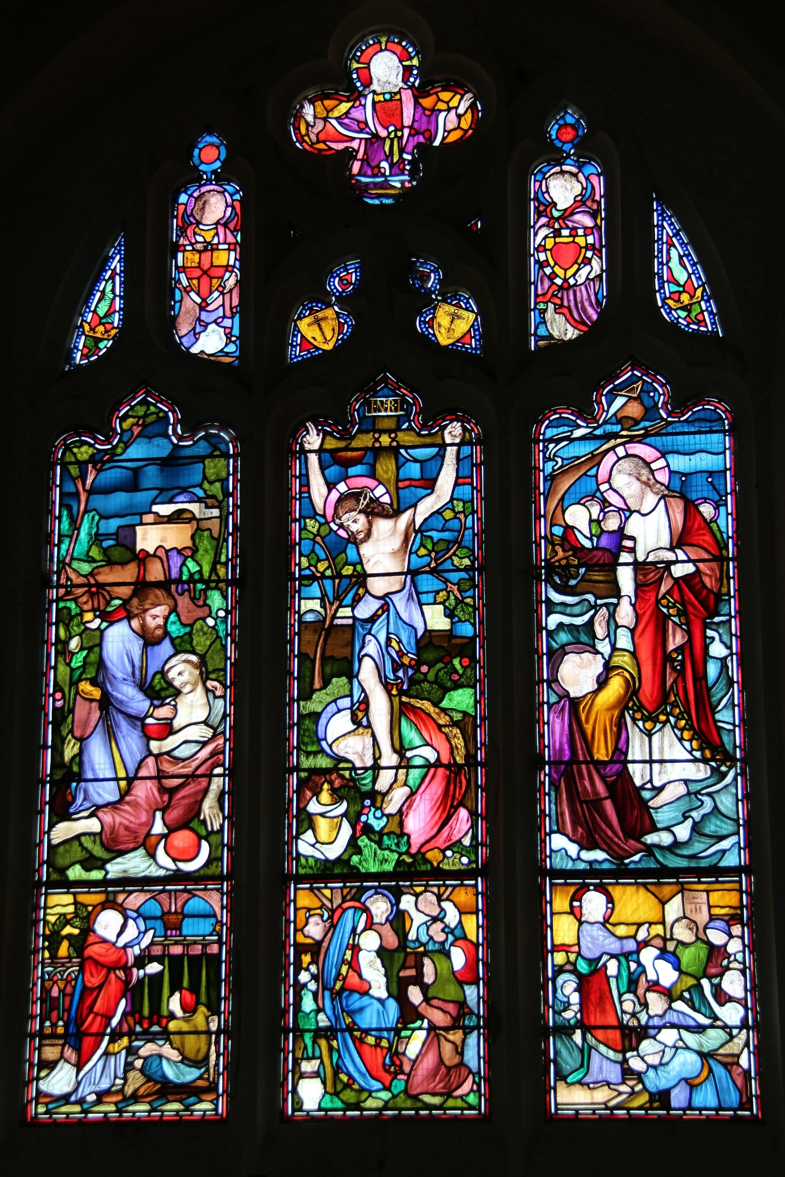 The east facing stained glass window was installed by specialists Messrs Lavers and Barraud and depicts scenes from the Bible with a medical theme, as a memorial to David Herbert Llewellyn whose story is told elsewhere in this book.