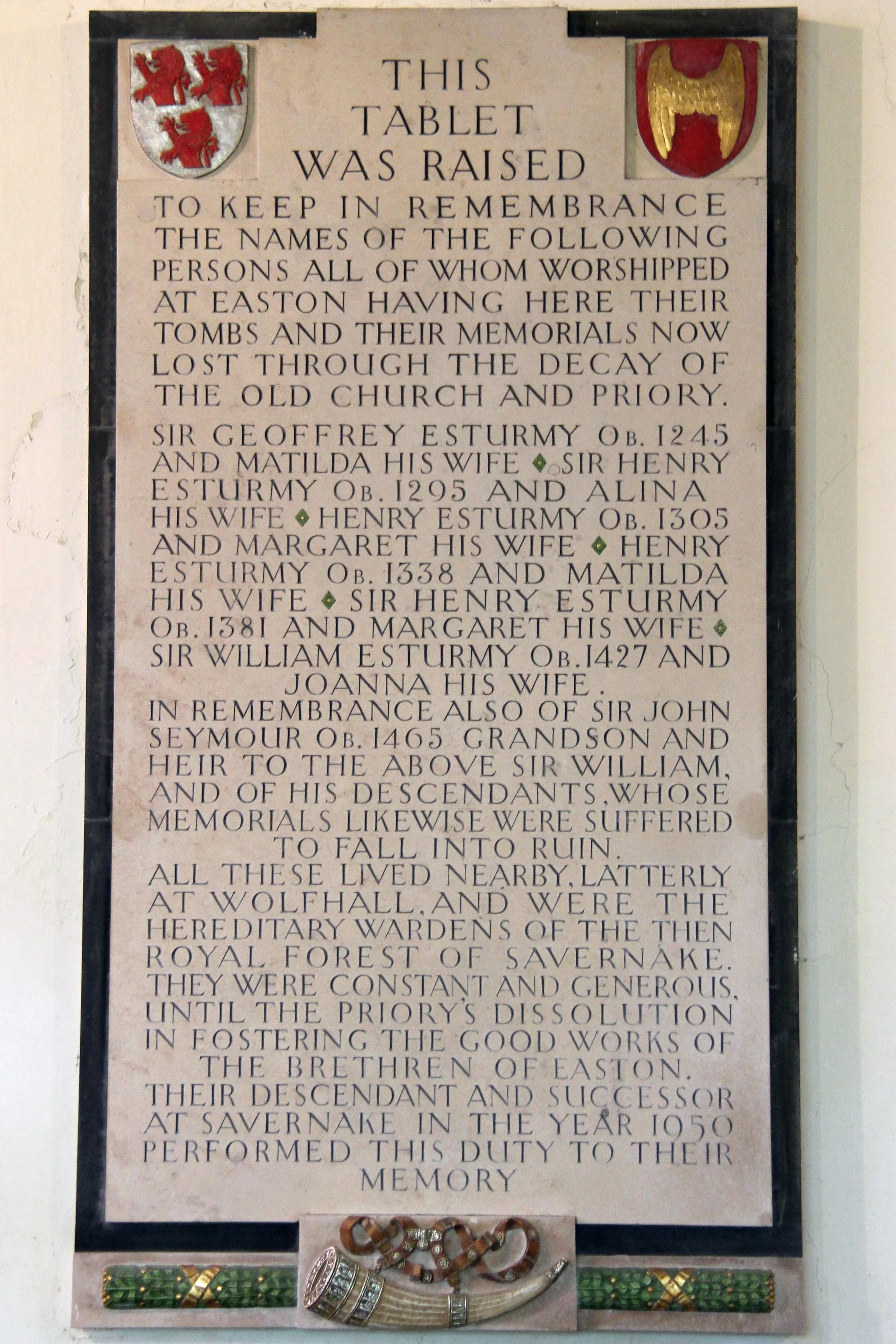 In 1951 a beautiful stone tablet was donated to the church by the Earl of Cardigan. Designed and carved by Mr Esmond Burton, the tablet is in memory of all the Esturmys and Seymours who had once been patrons of the priory.